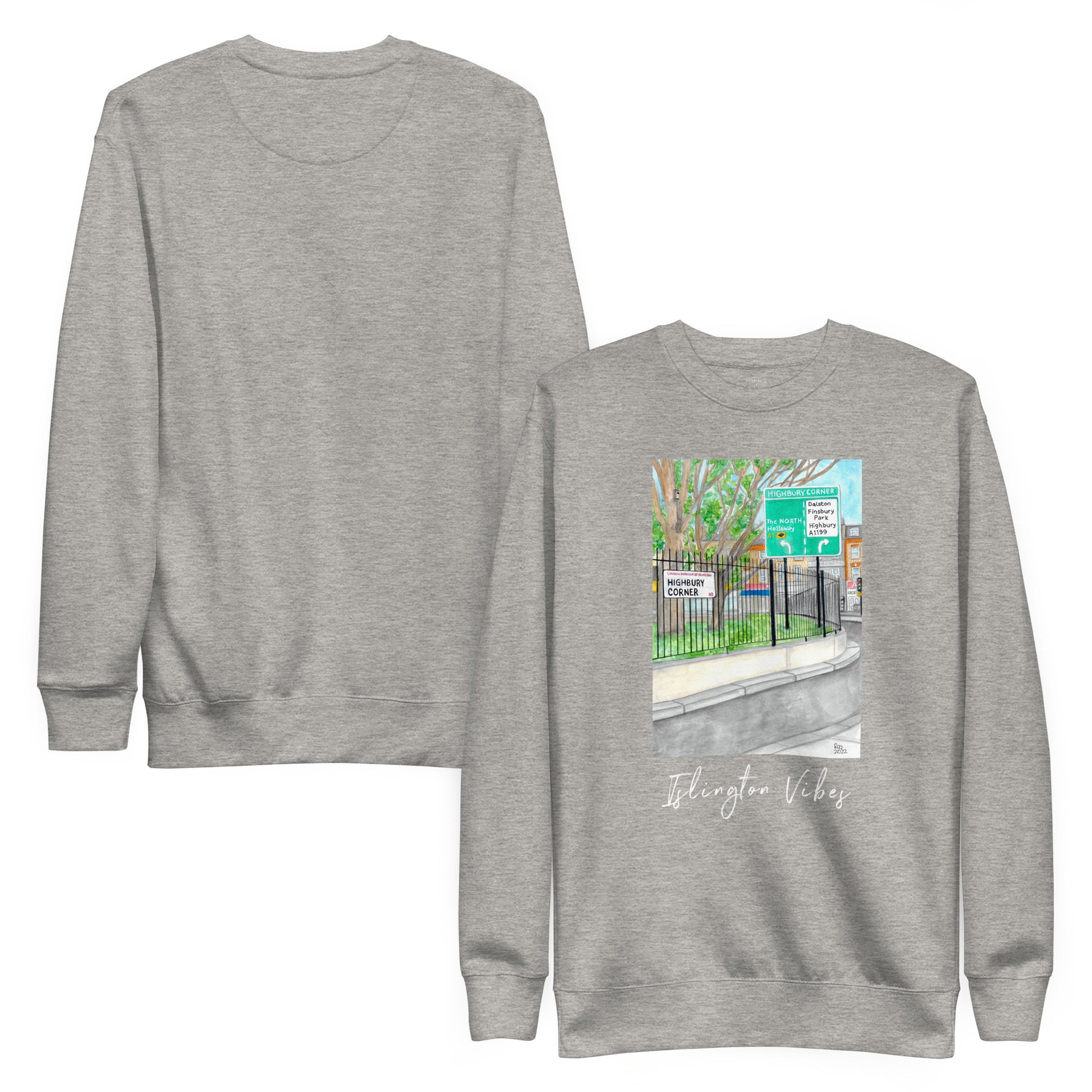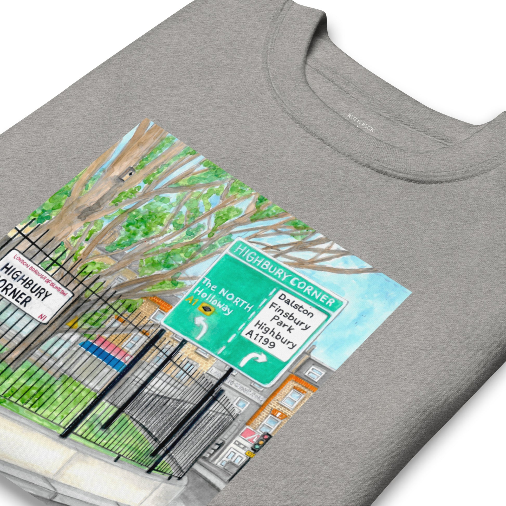 Wrap up with a North London icon. This Islington Vibes sweatshirt features Ruth Beck’s watercolour artwork of Highbury Corner, capturing the familiar green road sign and street corner that marks one of Islington’s best-known gateways. A place where countless journeys begin and end, Highbury Corner stands as a quiet symbol of home for locals and visitors alike. Crafted from a soft fleece-lined heavyweight cotton blend, this sweatshirt brings comfort, warmth, and everyday style — perfect for layering on cooler London days.