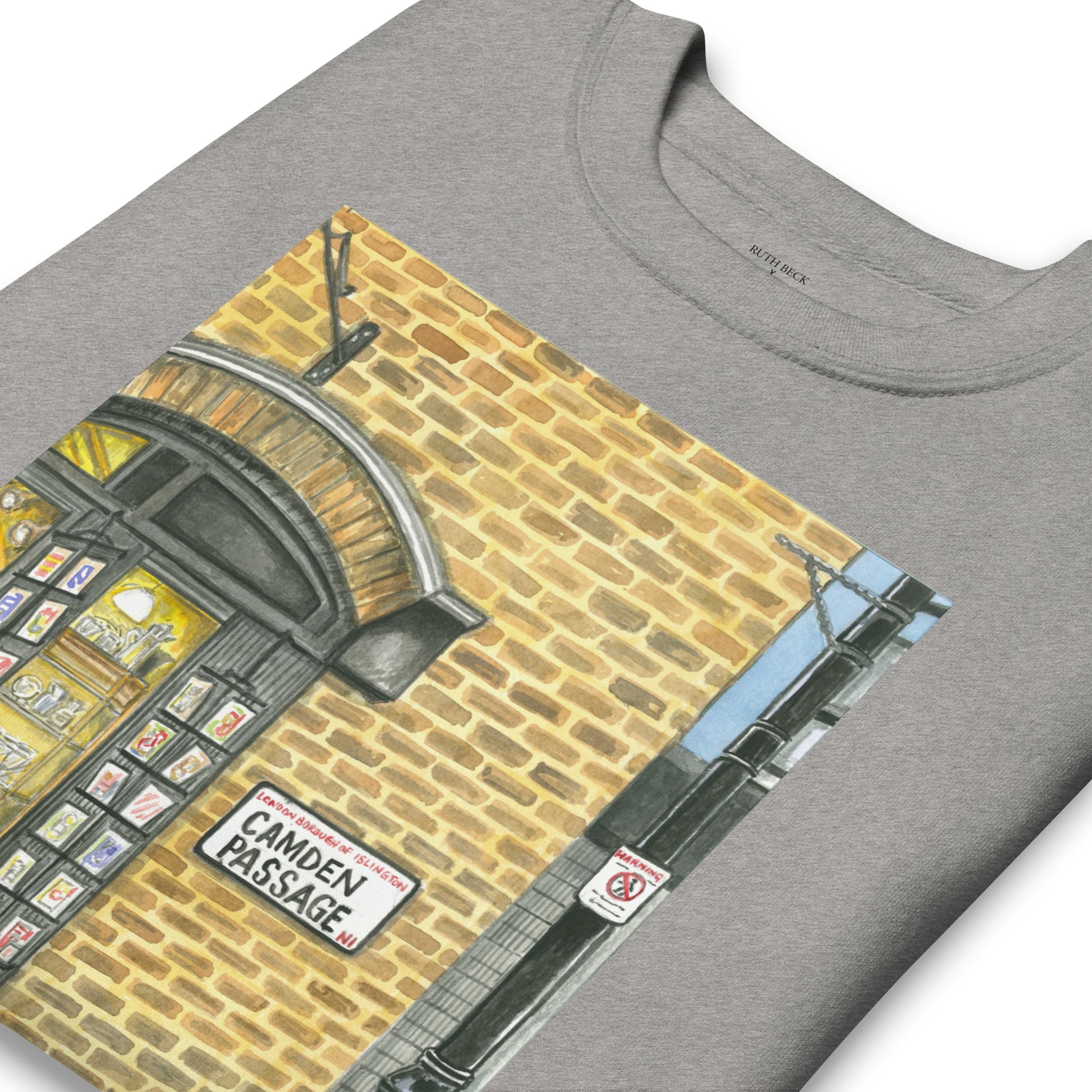 Layer up with a piece of Islington’s charm in this Islington Vibes sweatshirt, showcasing a watercolour artwork print by Ruth Beck of Camden Passage. Famous for its antique stalls, vintage shops, and tucked-away cafés, Camden Passage blends history and style in one of North London’s most atmospheric streets. With a soft fleece lining and classic ribbed crewneck silhouette, this sweatshirt brings comfort and timeless streetwear appeal — perfect for everyday wear.